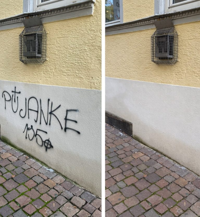 ✓ Auch farbige Fassaden – Graffiti-Entfernung auf gestrichenen Flächen inklusive exakter Farbwiederherstellung. Mithilfe eines Farbspektrometers kann die bestehende Fassadenfarbe nahezu originalgetreu nachgemischt und angeglichen werden.